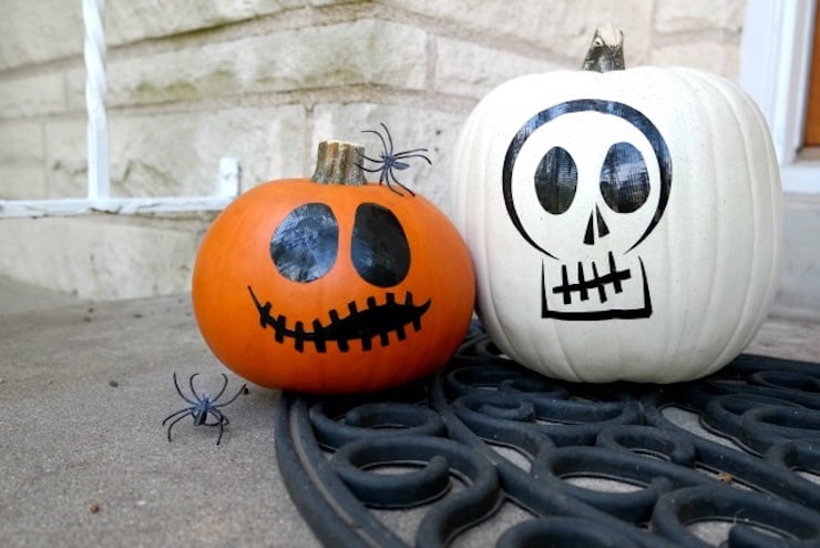 These black & white pumpkins are painted, and this is about as easy as it gets. The white pumpkins are painted with stencils, and the black ones are painted with satin black paint, then stenciled. Unfortunately, the tutorial isn’t available anymore, but we’ve left the pic here for inspo!