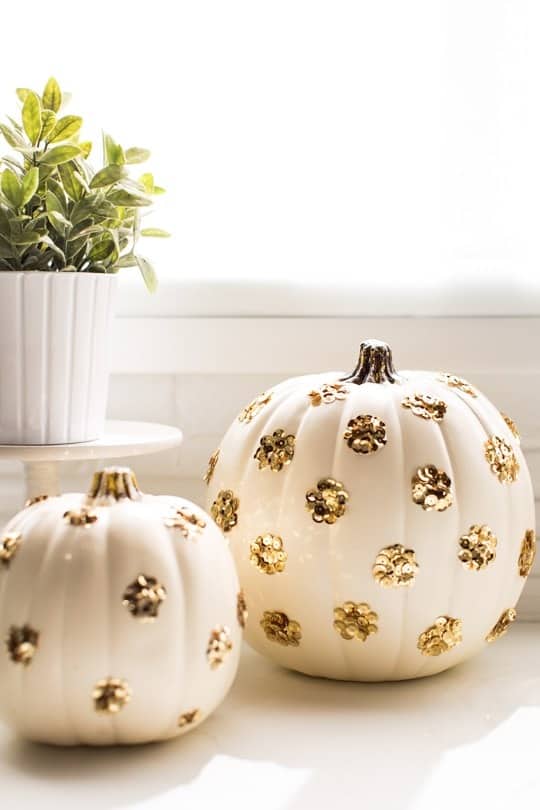 You can save yourself some time and effort if you can find naturally white pumpkins, but they’re not common in some areas. If you can’t find a white pumpkin, paint an orange one white! Love how the gold sequins give a glam, even Christmasy feel in this idea from Sugar & Cloth!